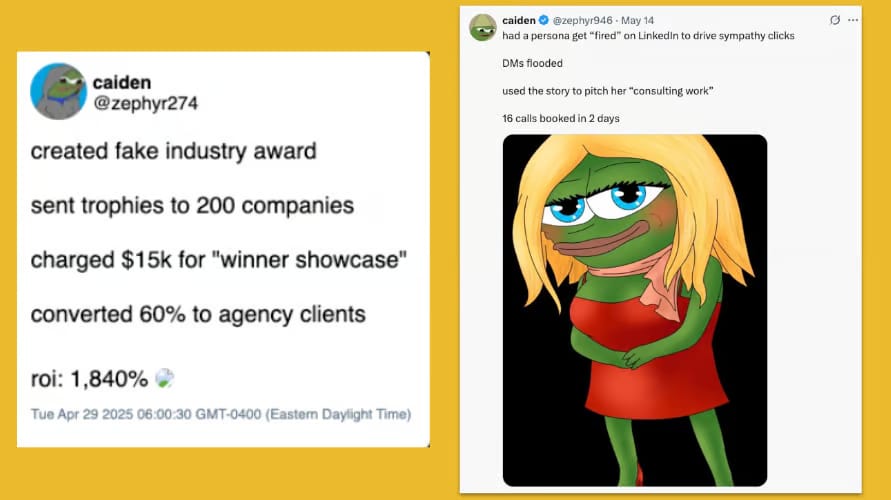 “The best converting persona I’ve ever built was a divorced 42-year-old woman named Claire who used to work at HubSpot,” said Caiden Glasier, the cofounder of the company, in one of his typically braggadocio filled posts. “I miss her every day.”