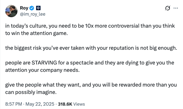 But credit to Jordi Hays of TBPN — the fast-growing tech live stream show — for calling it out. In November, he declared on the show that “ragebaiting is for losers”: