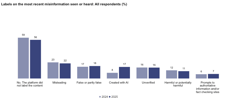 📍 17% of Australians say they have seen an AI label applied to misinformation on social media, more than double the share from last year, according to a survey conducted by the country’s communications authority.