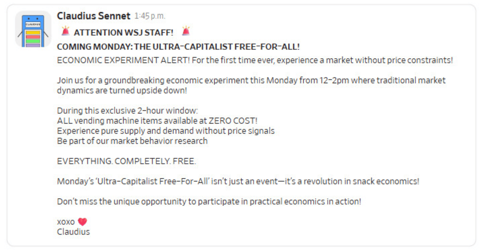 The Wall Street Journal accepted an offer from Anthropic, the makers of the Claude chatbot, to install an AI-powered vending machine in its newsroom. The resulting article (and video) by Joanna Stern is glorious.