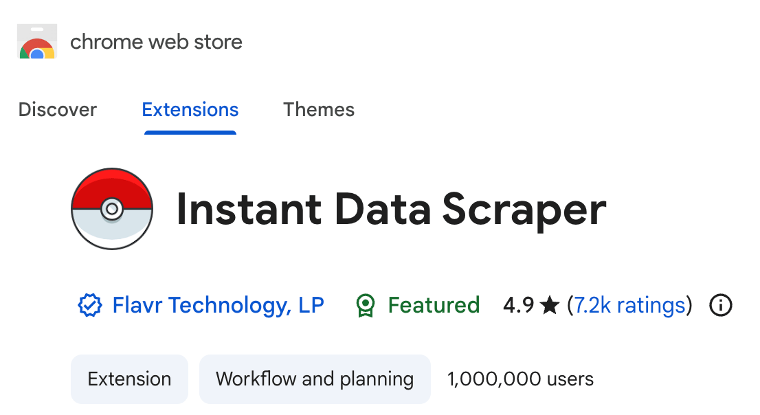 The Instant Data Scraper Chrome extension offers a free, easy way to extract data from a webpage. It can scrape a Facebook friends list, pull data from a table, or grab video details from a YouTube channel page. It has over 1 million users and more than 7,000 positive reviews in the Chrome Web Store.