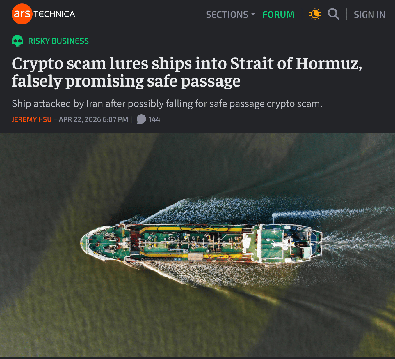 Apparently some shipping companies with vessels stuck in the Persian Gulf claim to be getting fraudulent messages from scammers telling them they can get through the Strait of Hormuz if they pay a "transit fee.” In crypto, of course.