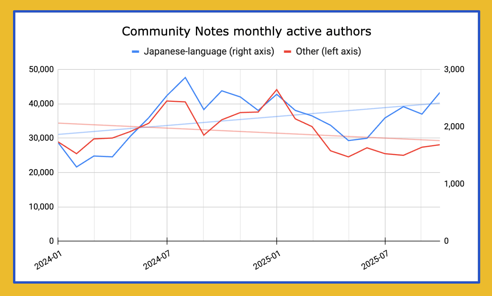 While the global Community Notes community contracted in 2025, the average number of contributors writing notes in Japanese grew by 8% (see chart below; watch the axes).