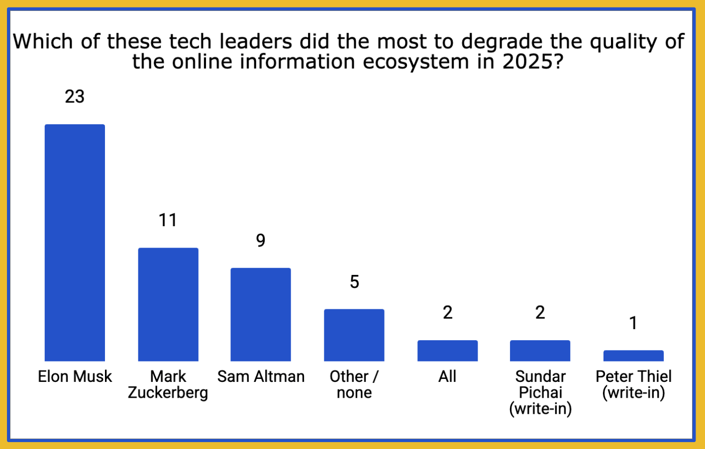 Asked to pick the CEO who had the most detrimental effect on online information quality this year, 23 out of 53 opted for Elon Musk, whom we had nominated for his attacks on Wikipedia and reckless deployment of Grok.