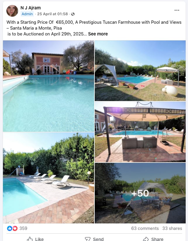 Three other houses advertised by "Paradise" this week are also not for up auction. Instead, they are listed on immobiliare.it and other portals for about ten times the price indicated on the Facebook posts (see 1, 2, 3).