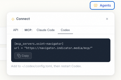 Indicator members can connect Navigator to an AI model or other system by clicking the “Agents” button below the search bar: