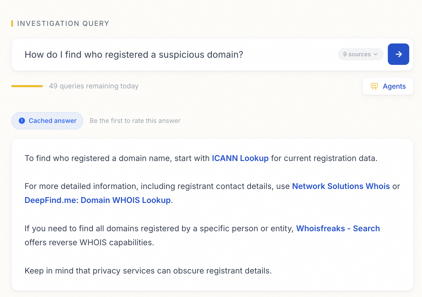 Type a query in the search bar and Navigator generates a list of relevant tools. Some queries also produce a "Cached answer.” This is produced by members and other OSINT experts who have contributed. It provides additional guidance about the tools that might be useful for your task.