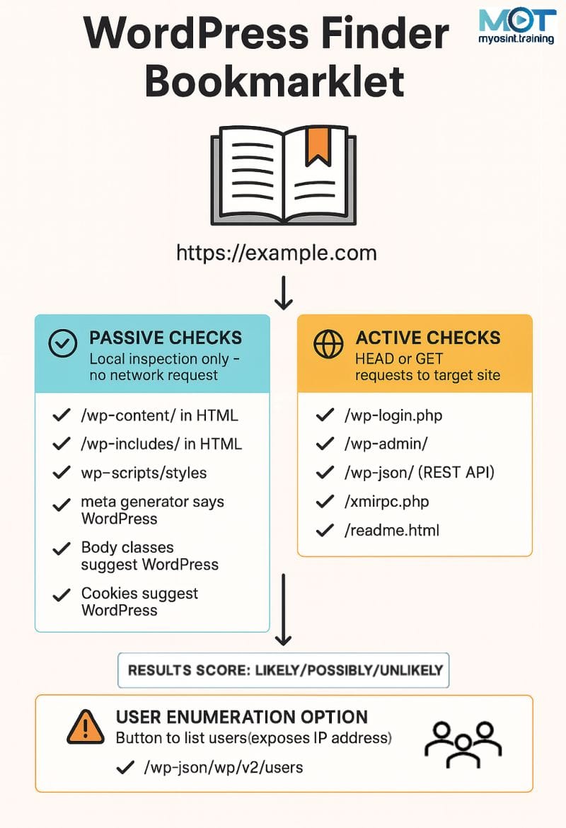 Our friends at My OSINT Training just released a new free bookmarklet that was inspired by my recent post, “OSINT tips for investigating WordPress sites.” It’s called the WordPress Finder Bookmarklet and it does two things: