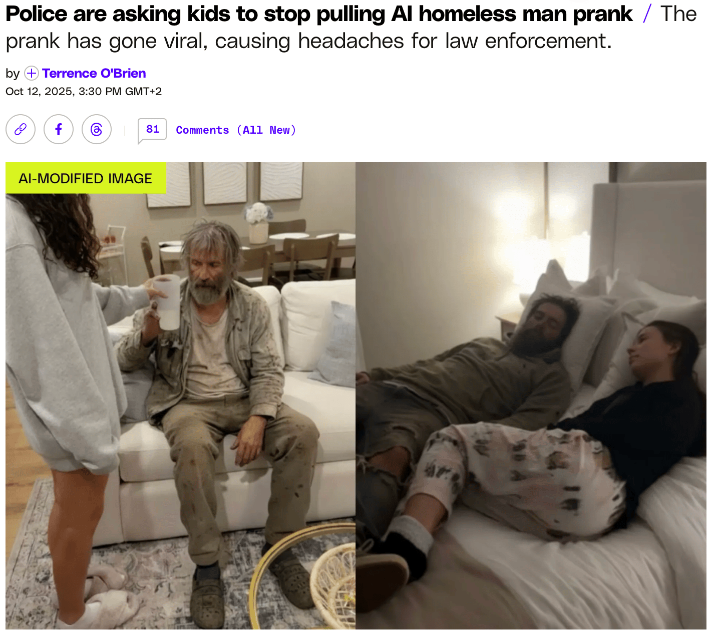 Kids have found a new use for AI: trolling their parents. The Verge reports that children across America are inserting a synthetic image of “a disheveled, seemingly unhoused person in their home and sending them to their parents.” Parents often believe there’s a stranger in the home and freak out, sometimes even calling the cops.