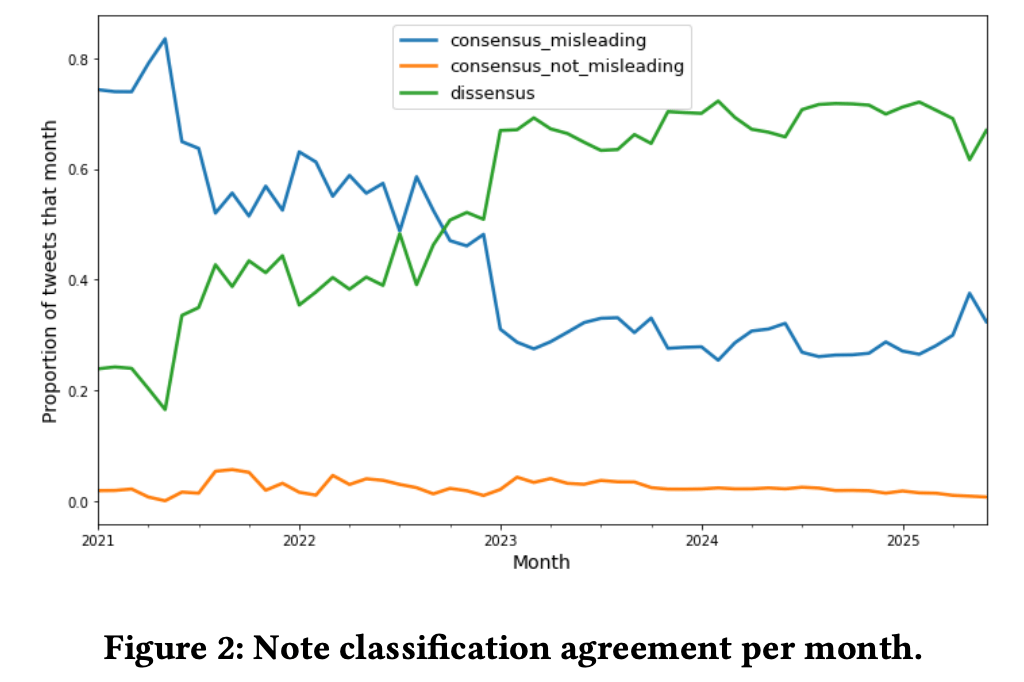 📍 A working paper about X’s Community Notes argues that it is now a “platform for debate rather than moderation” given that a majority of posts that receive notes are annotated as “No Notes Needed.” The study also found that once the program expanded to all X users, there were much higher levels of dissensus over whether a tweet was misleading or not.