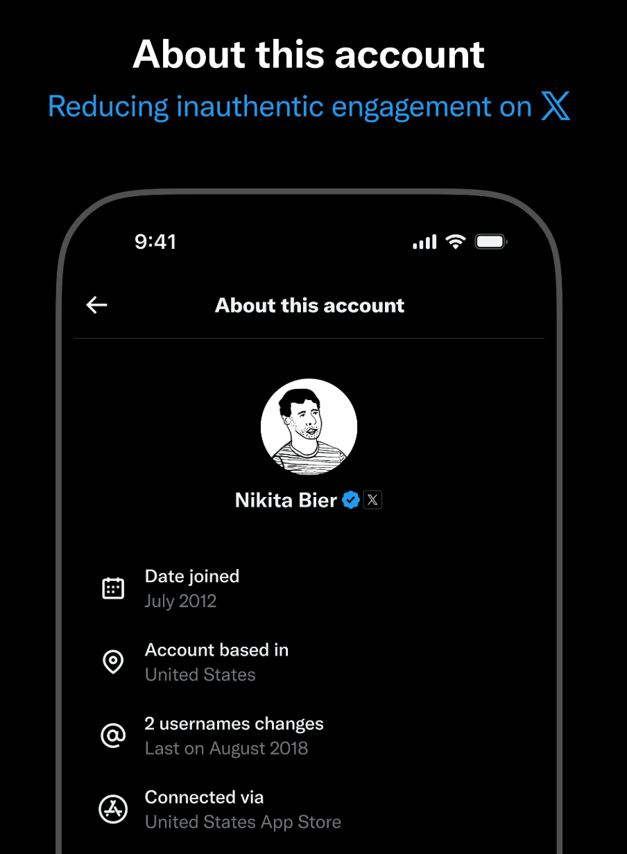 📍 Nikita Bier, X’s head of product, said that the platform is “experimenting with displaying new information on profiles, including which country an account is based, among other details.” The goal is to provide additional signals to evaluate the credibility of an account. Bier shared a mock up: